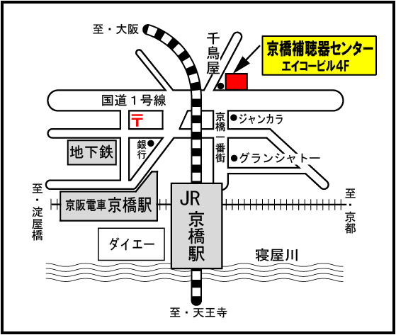 京阪京橋駅中央口を出てJRの改札方向へ歩いて頂き、商店街を左へ(北方向)環状線沿いに歩いてください。国道1号線の横断歩道を渡って正面のビルの4階です。(千鳥饅頭・石松メガネ・薬局があるビルです)